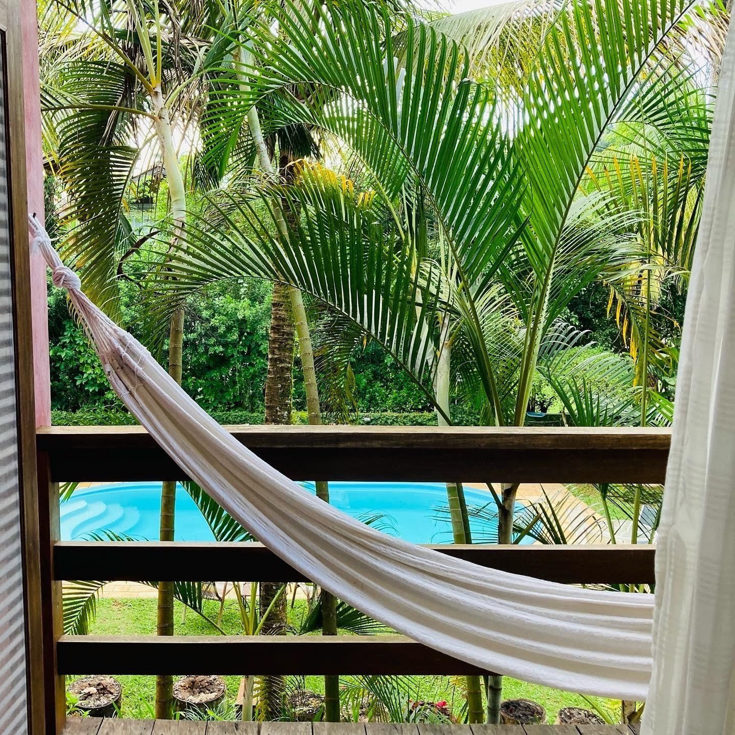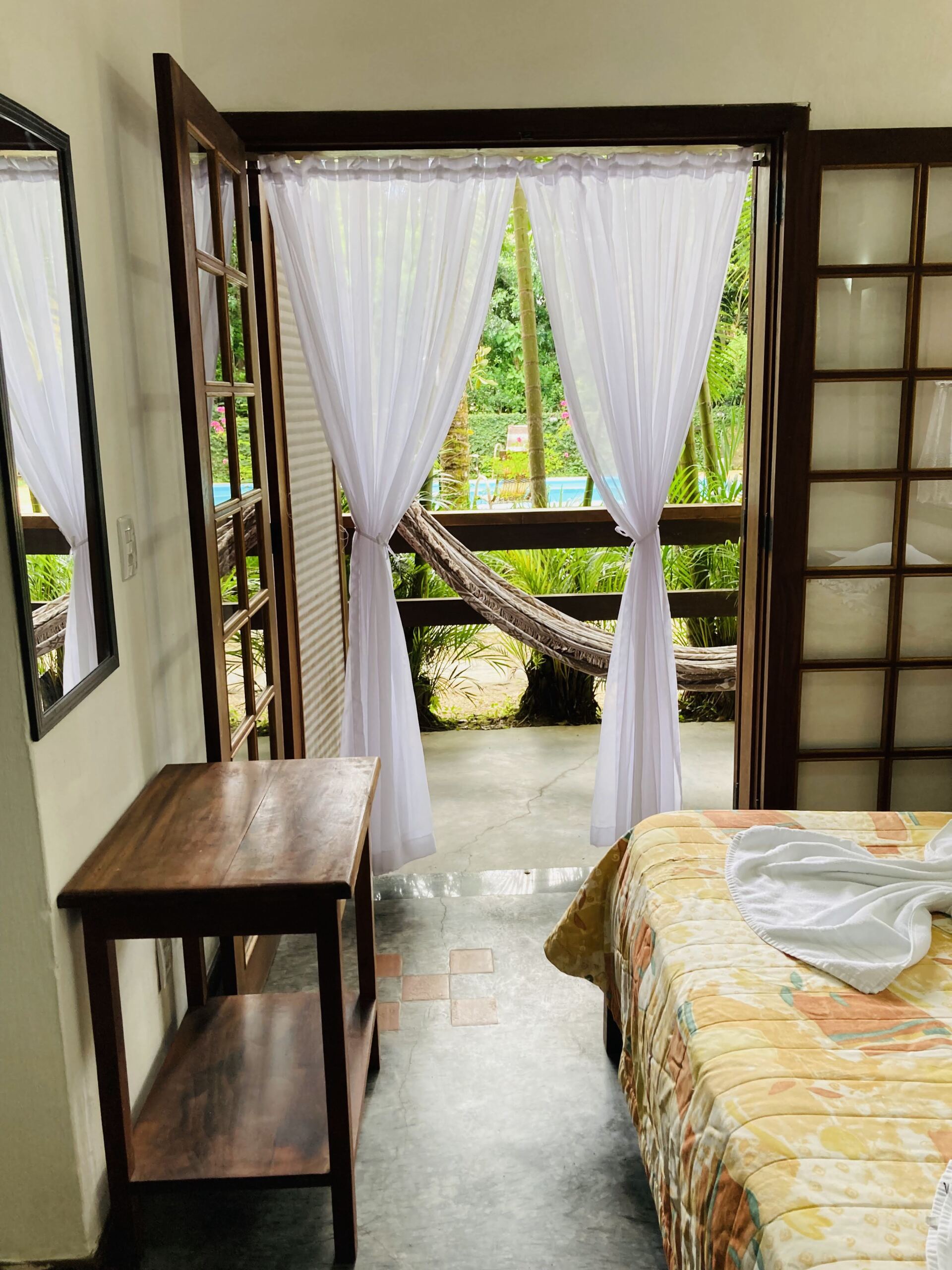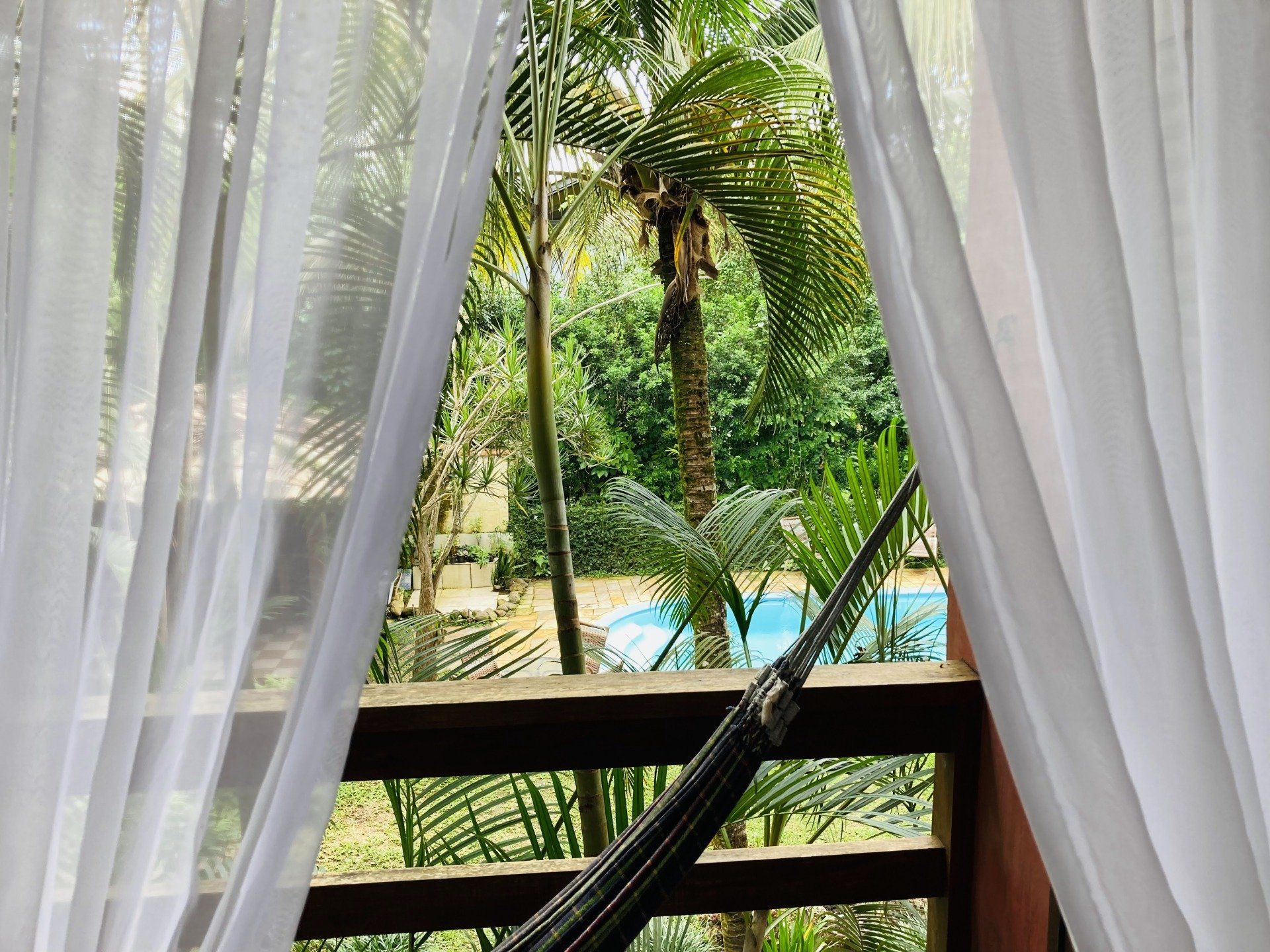 Que tal acordar com essa vista do nosso jardim e piscina? Nossas suítes Superior tem 25m2, cama queen size, banheiro privativo, televisão e varanda com rede.