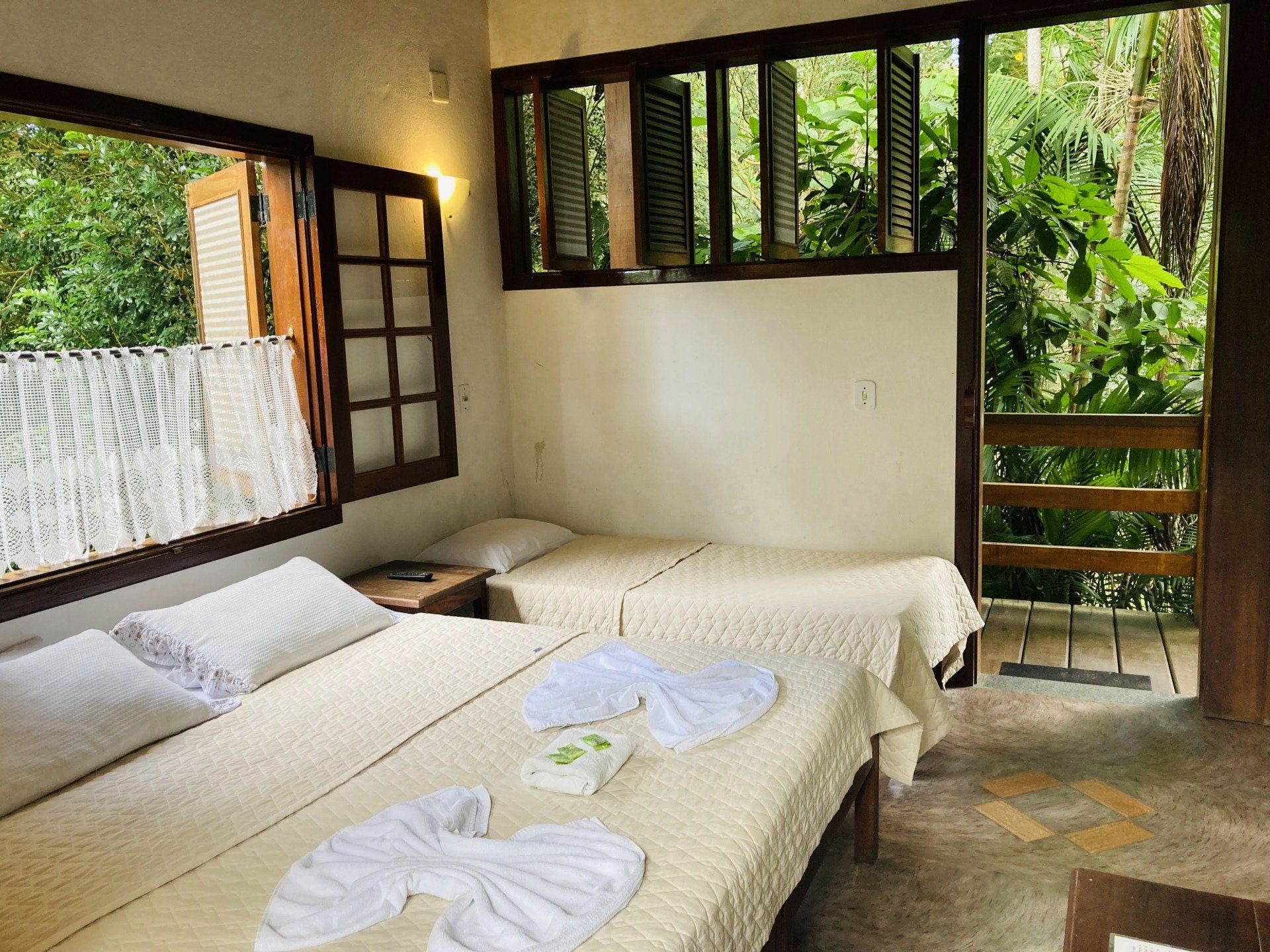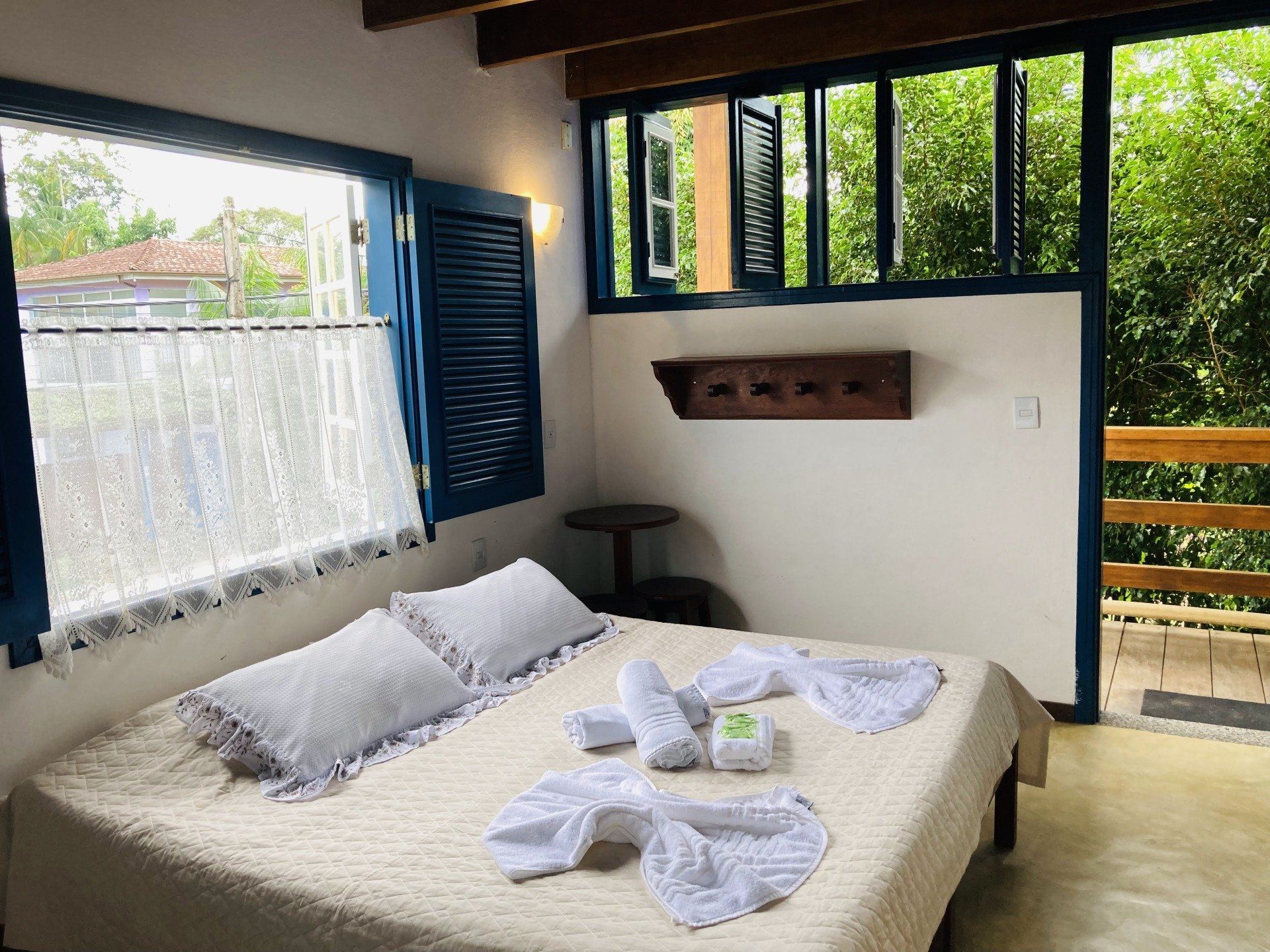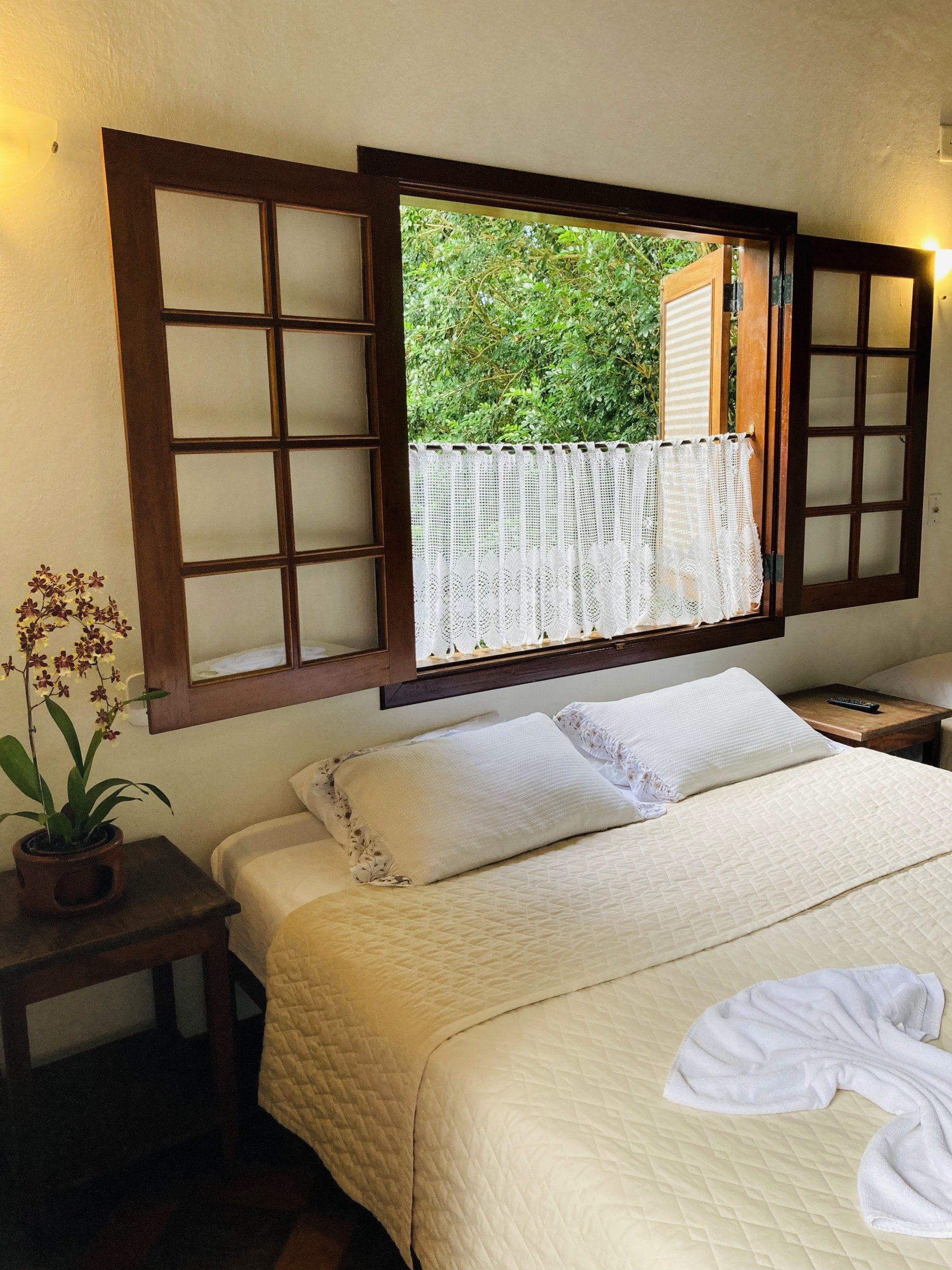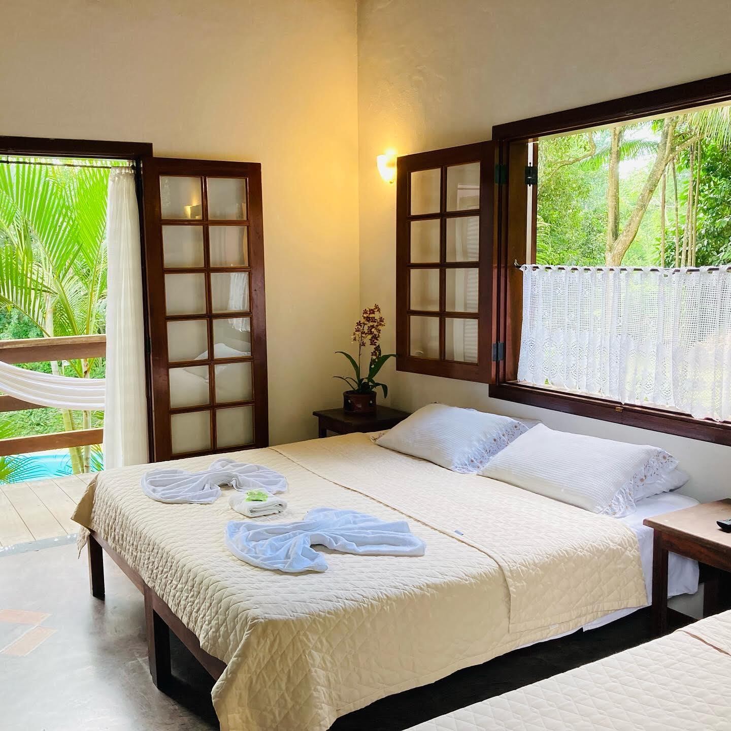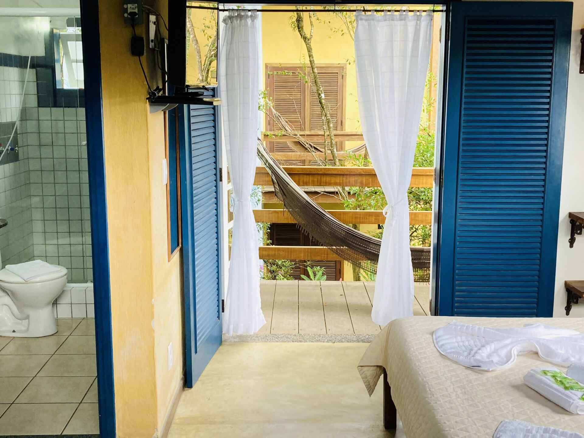 Visitando #Paraty, hospede-se na #Pousada Rumo dos Ventos. Essa é nossa Suíte Jardim Térreo. São 25m² de muito conforto. Camas Queen size, varanda com rede, televisão e banheiro privativo.