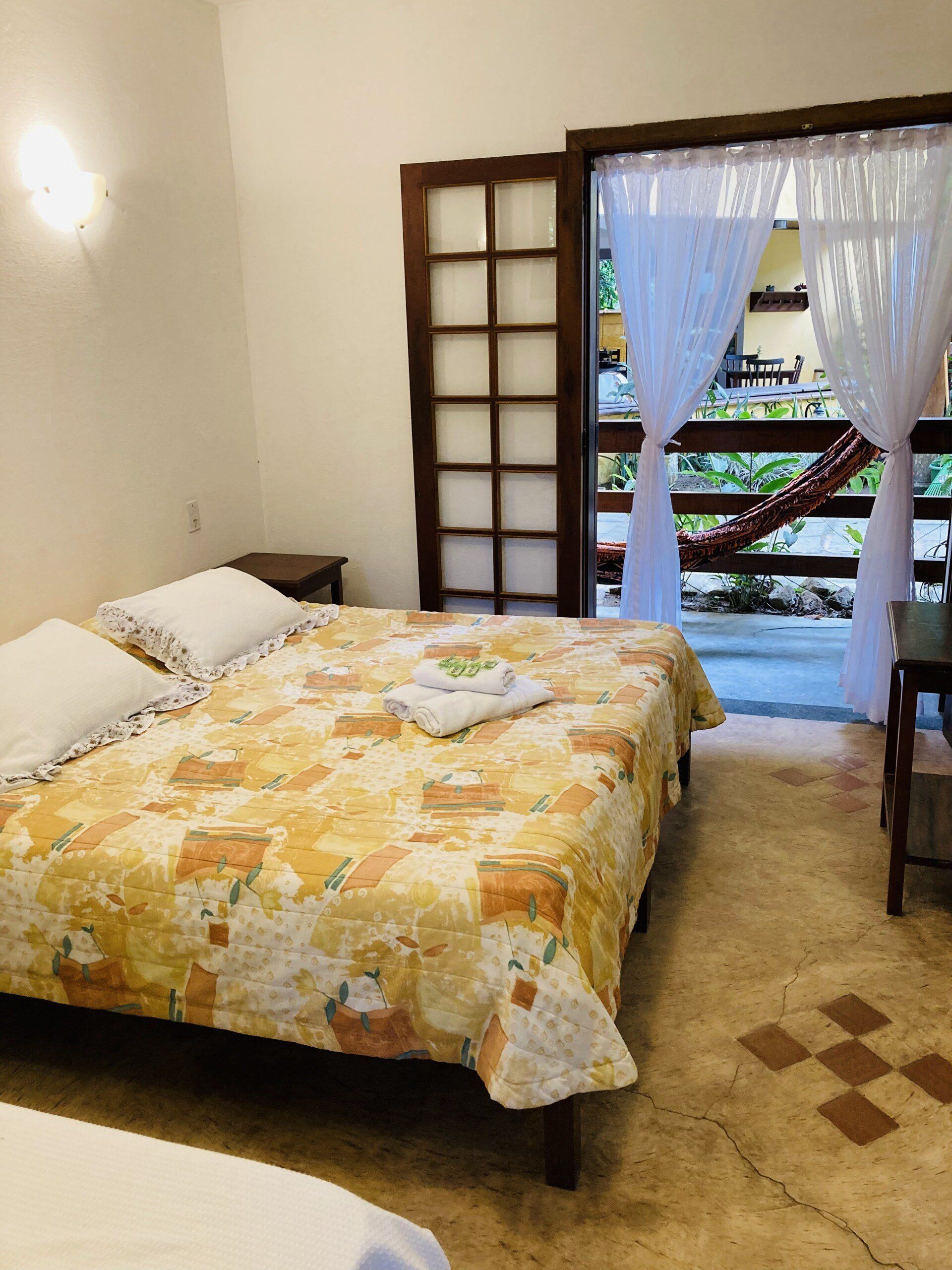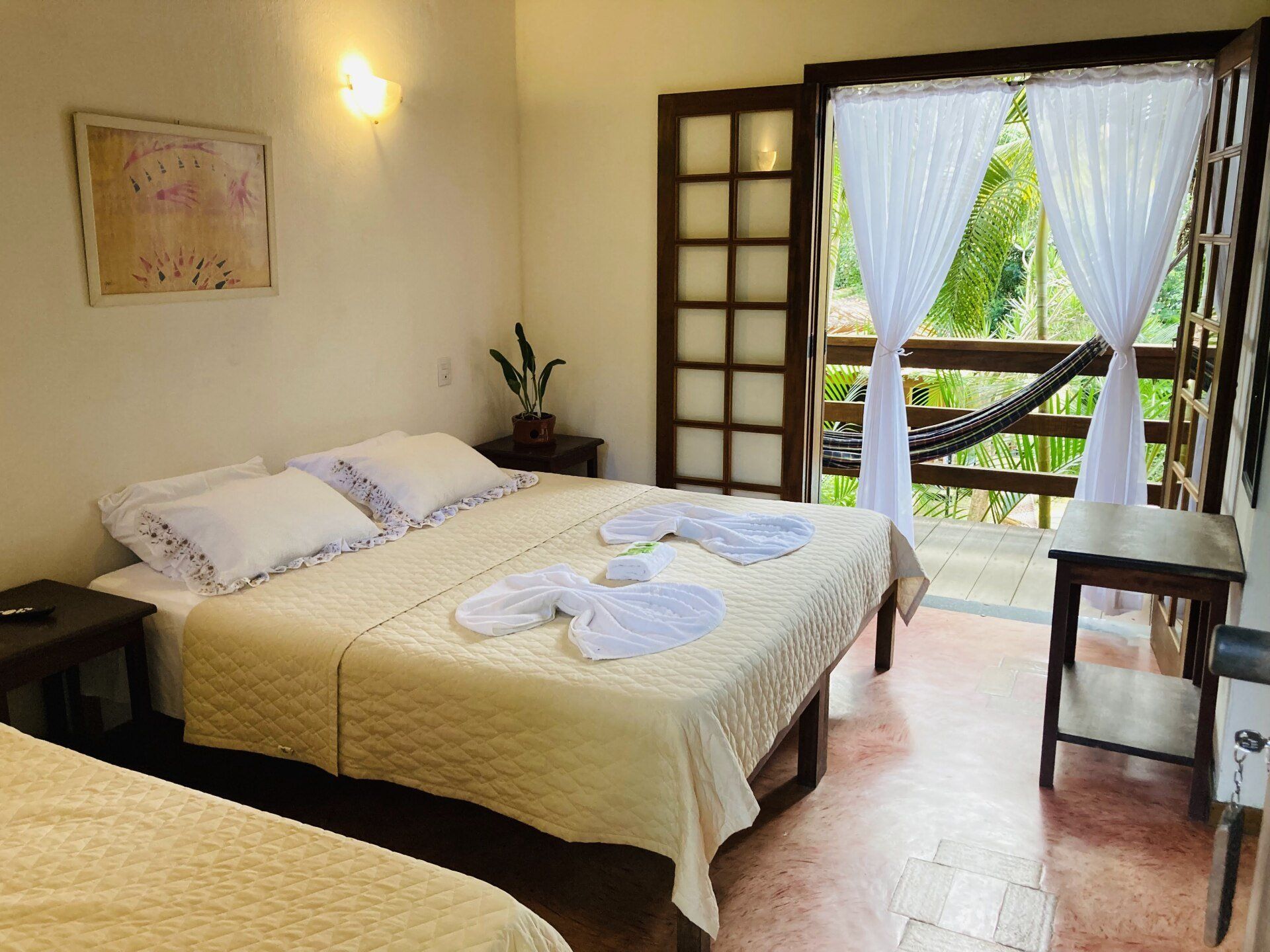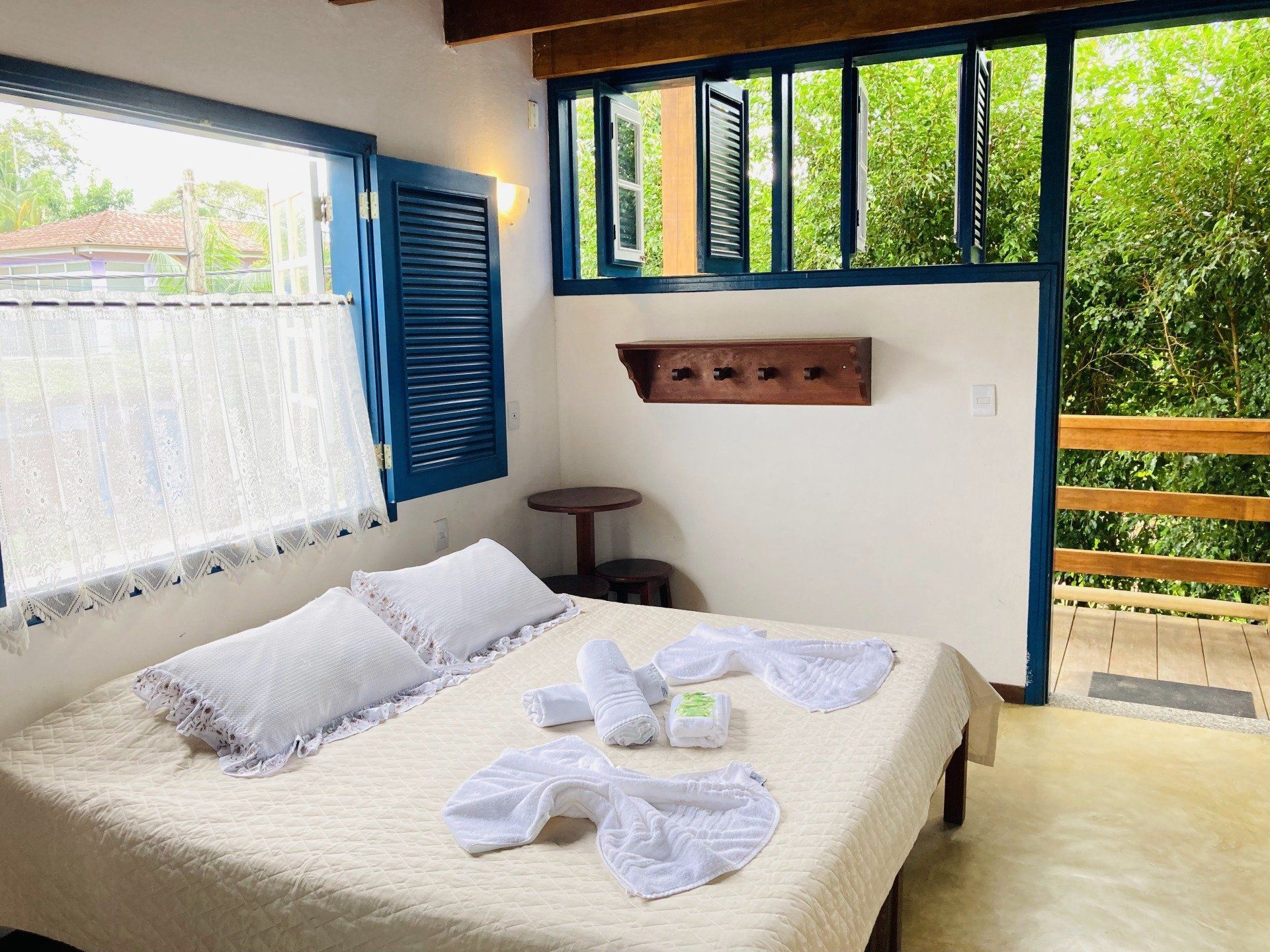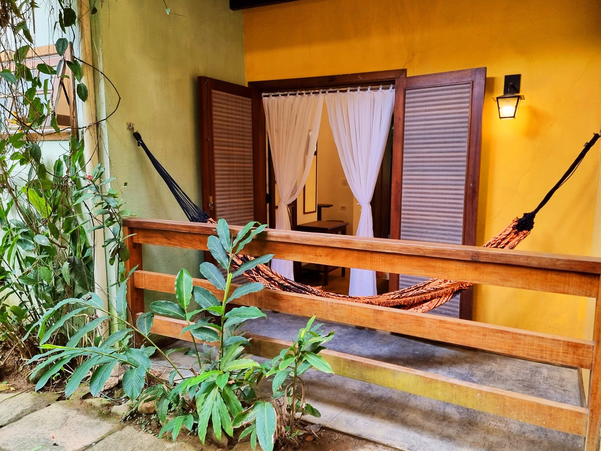 Visitando #Paraty, hospede-se na #Pousada Rumo dos Ventos. Essa é nossa Suíte Jardim Térreo. São 25m² de muito conforto. Camas Queen size, varanda com rede, televisão e banheiro privativo.