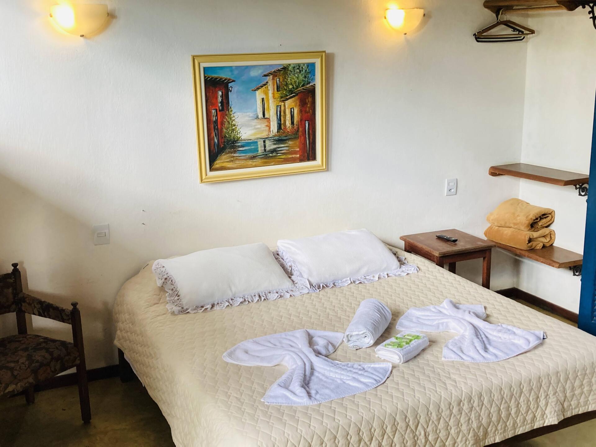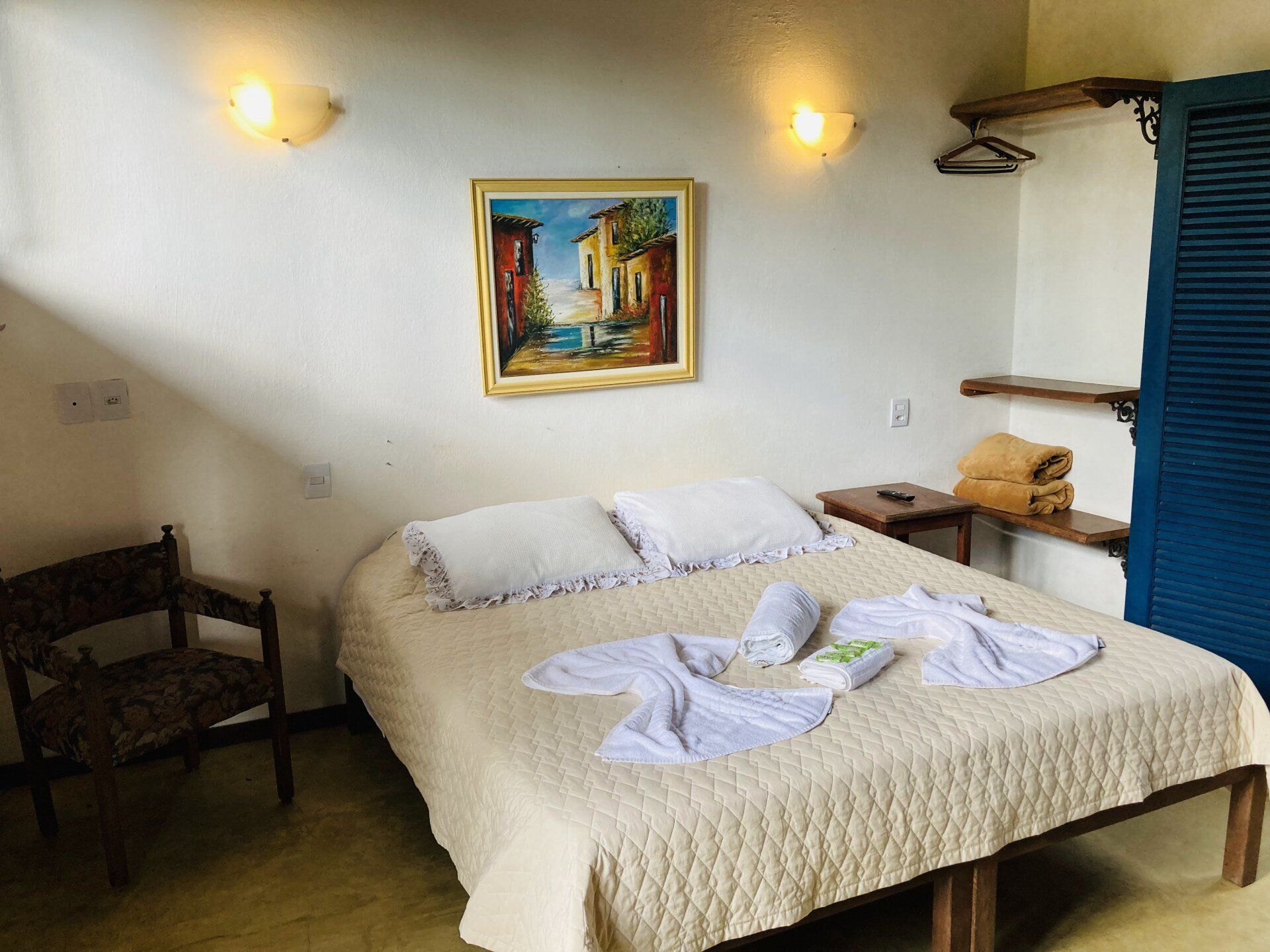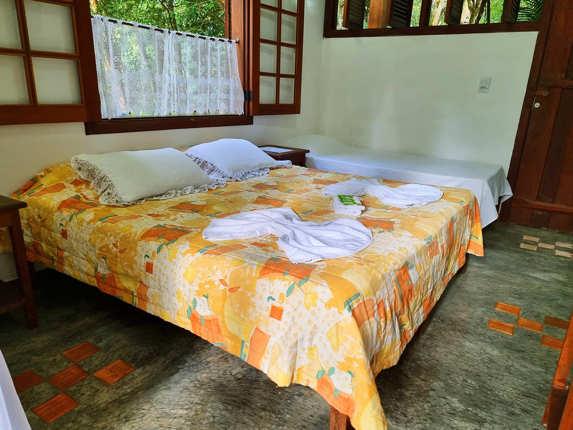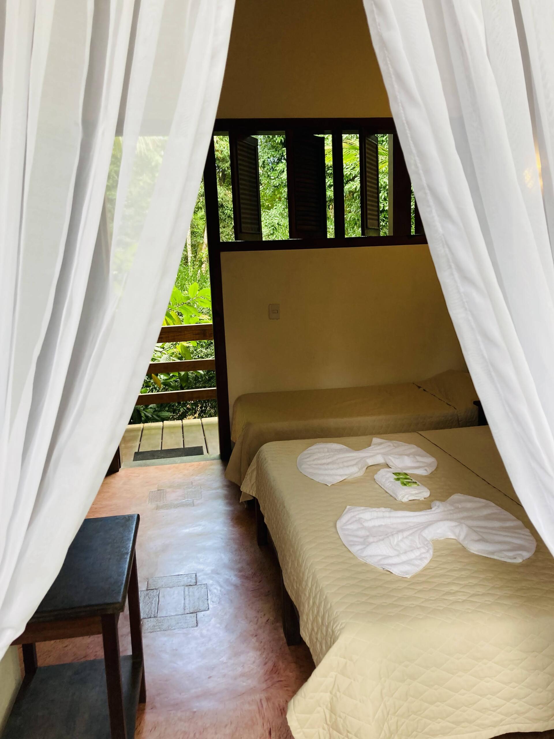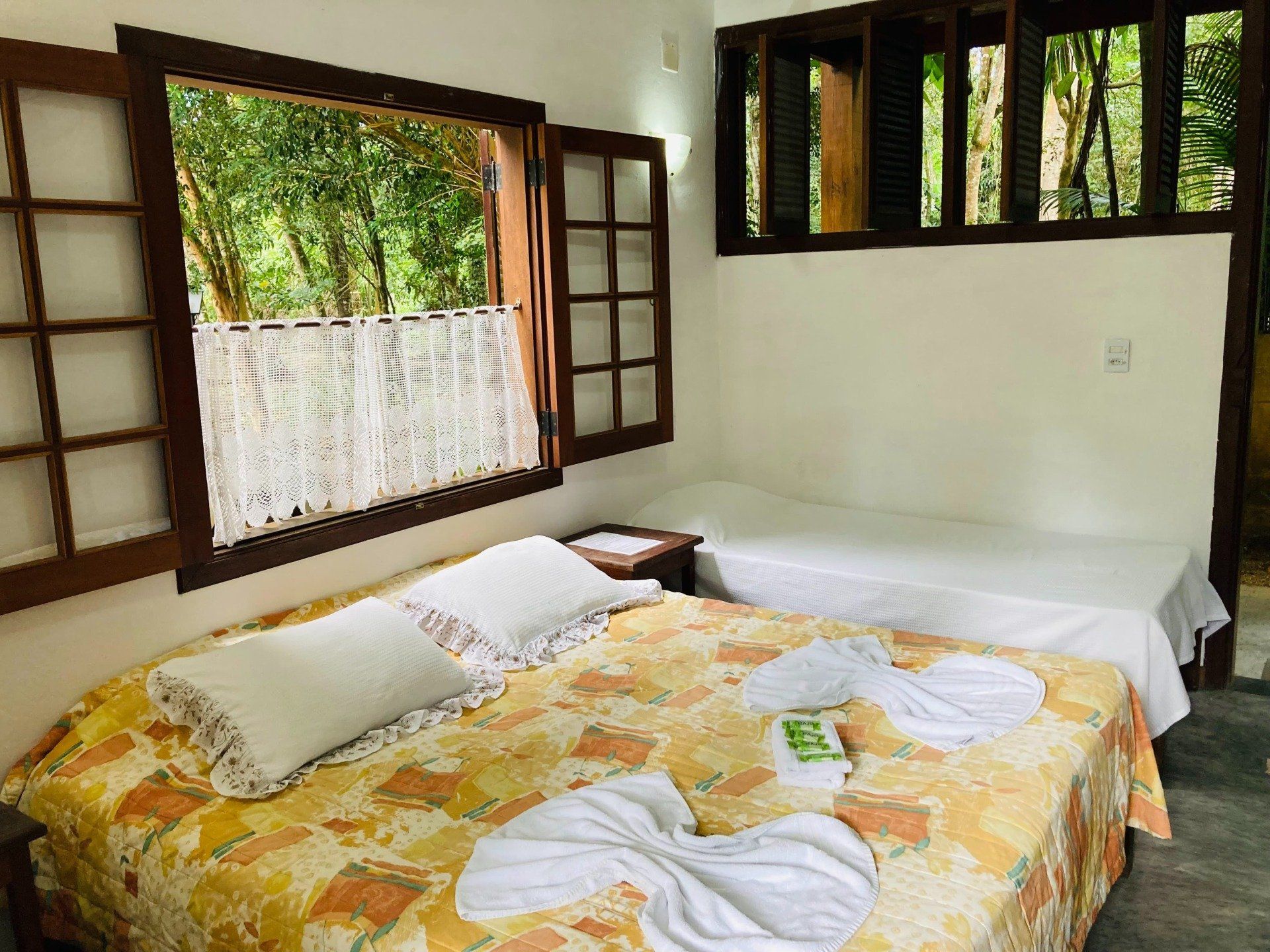 Visitando #Paraty, hospede-se na #Pousada Rumo dos Ventos. Essa é nossa Suíte Jardim Térreo. São 25m² de muito conforto. Camas Queen size, varanda com rede, televisão e banheiro privativo.