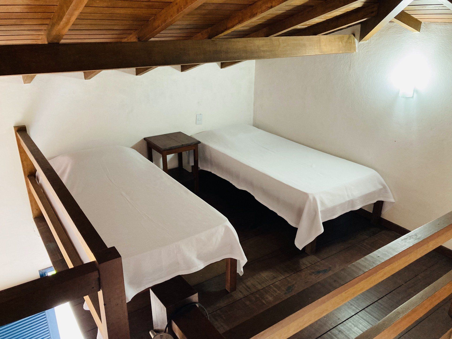 Essa é nossa suíte Jardim Superior com Mezanino. Capacidade para até 4 pessoas em camas Queen ou de solteiro. Banheiro privativo, varanda com rede, televisão e muito espaço e conforto para você e sua família.